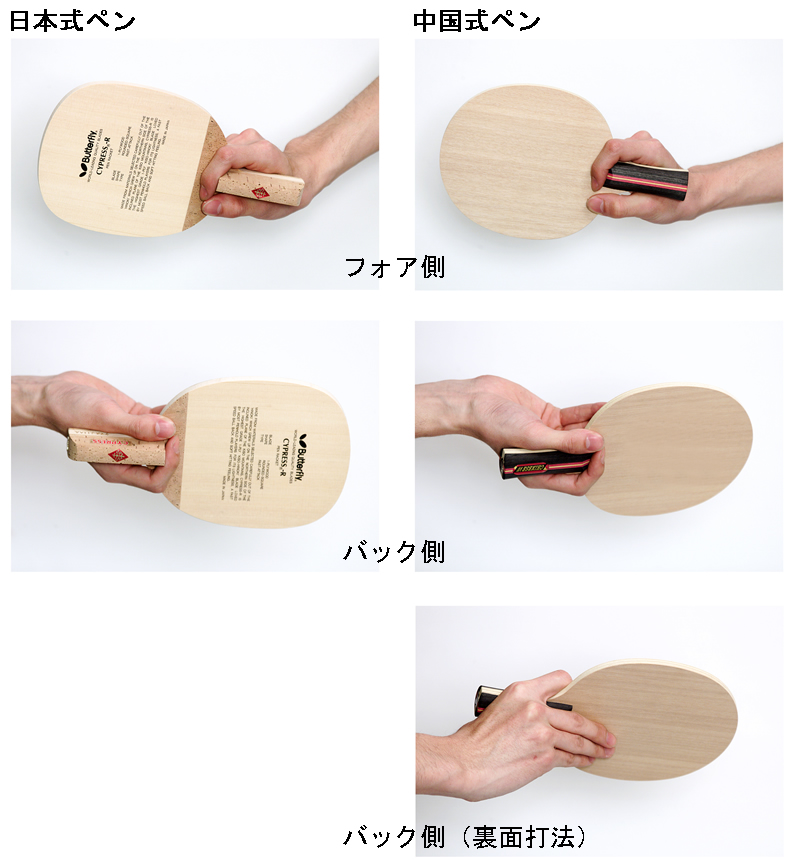 日本式ペンと中国式ペンとの一番の差はバック打法にあります(写真)。すなわち、日本式ペンはフォアもバックも同一の面で打ちますが、中国式ペンは両面にラバーを貼ることによりシェークハンドタイプと同様にフォア,バック各々専用の面で打つことも可能となります。(日本式と同様に同一面で打つことも可能です。)
